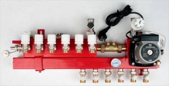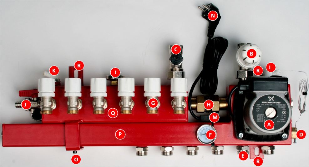 Ook in de Qualifloor verdelers wordt het warme water vanuit de toevoer (CV of stadsverwarming)vóór de pomp gemengd. Daardoor wordt de volledige capaciteit van de circulatiepomp gebruikt voor de vloerverwarming.